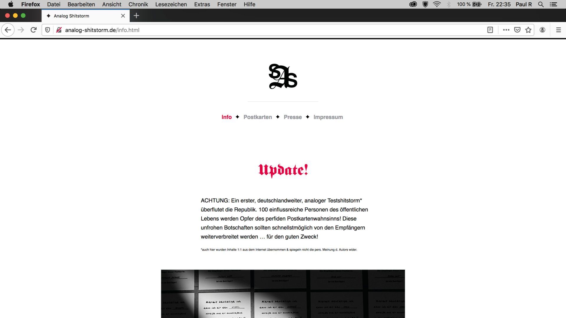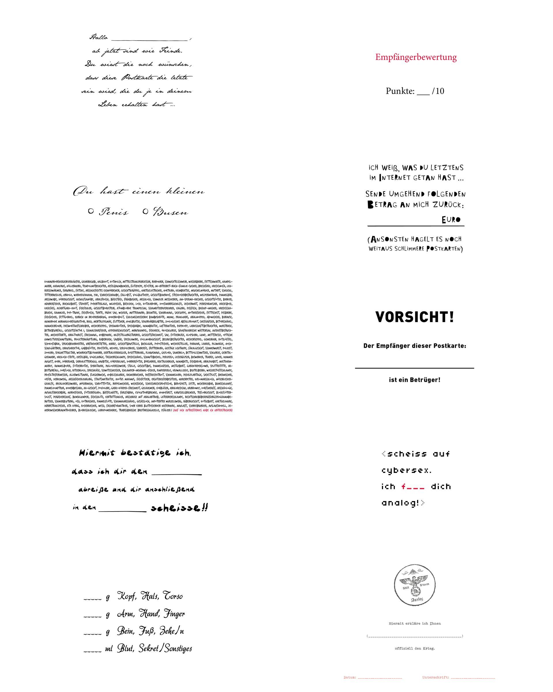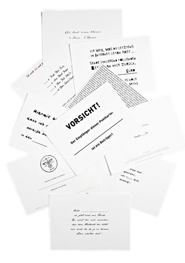 ACHTUNG: Ein erster, deutschlandweiter, analoger Testshitstorm überflutet die Republik. 100 einflussreiche Personen des öffentlichen Lebens werden Opfer des perfiden Postkartenwahnsinns! Diese unfrohen Botschaften sollten schnellstmöglich von den Empfängern weiterverbreitet werden – für den guten Zweck! Die Inhalte wurden 1:1 aus dem Internet übernommen und spiegeln nicht die persönliche Meinung des Autors wider.